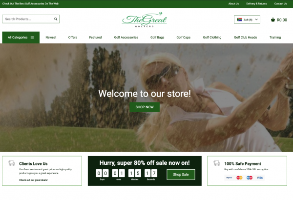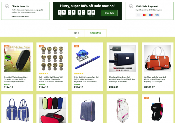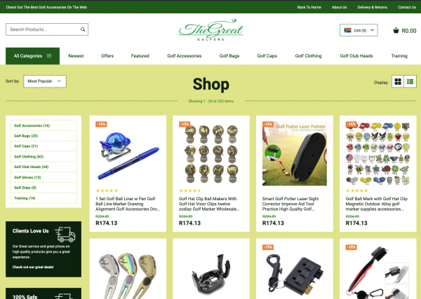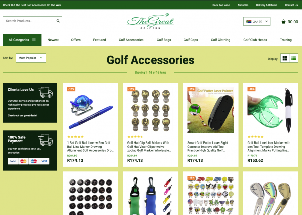 A fantastic Golf and Accessories store with over 200 products with multiple product categories including golf clubs, golf gloves, golf clothes, golf caps and accessories through your dropshipping store, with all the products hand chosen to compliment each other without them being overly available in the local market to ensure you keep your edge of uniqueness, with worldwide delivery.